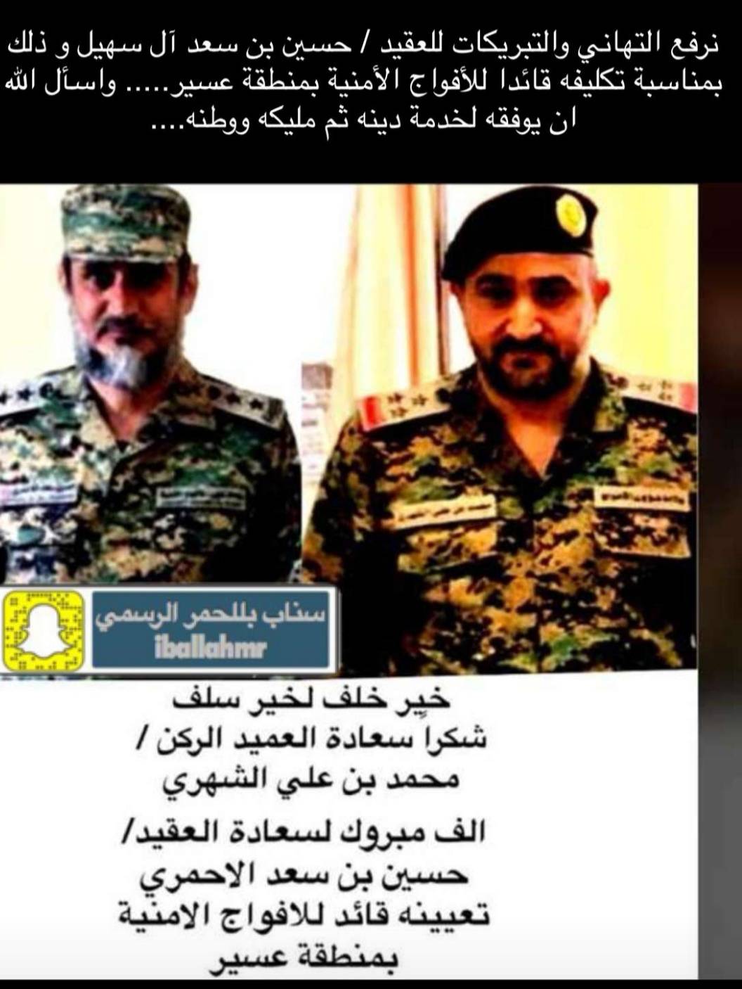 سـنــا ب بــلـلــحـمــر Auf Twitter نتقدم بخالص التهاني والتبريكات للعقيد حسين بن سعد ال سهيل بمناسبة تكليفه قائدأ للافواج الامنية بمنطقة عسير ونتمنى له التوفيق لخدمة دينه ووطنه ومليكه بللحمر Https T Co Z0zx7sdkwz
